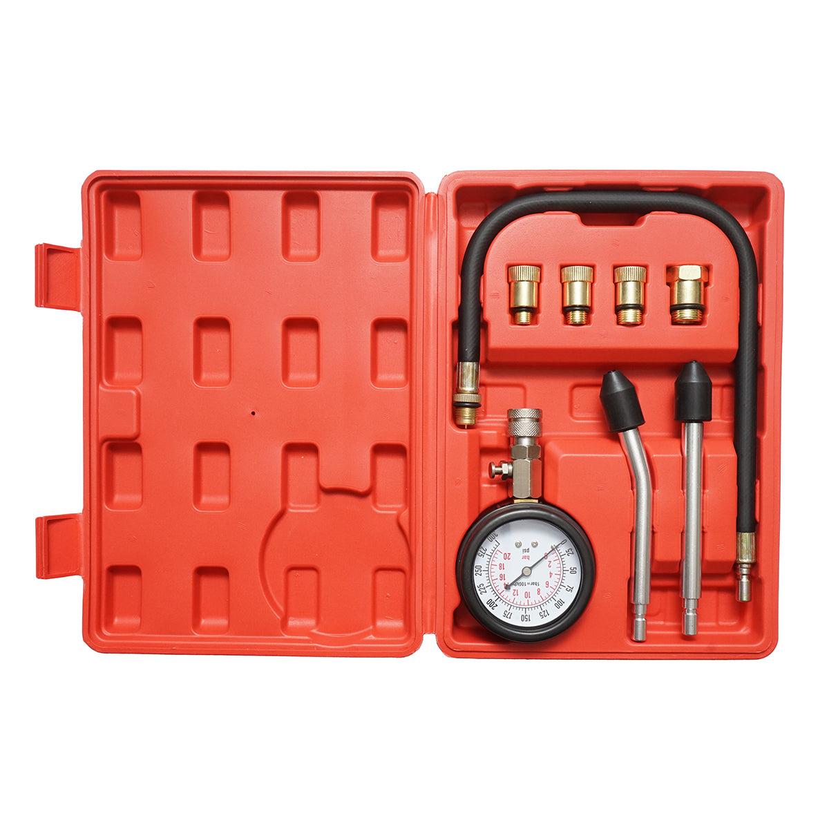 Tester for measuring compression pressure in spark ignition engines such as cars and motorcycles with gasoline engines. A gauge with an easy-to-read mechanical display indicates the measurement value (in units: psi, Kpa, Bar).