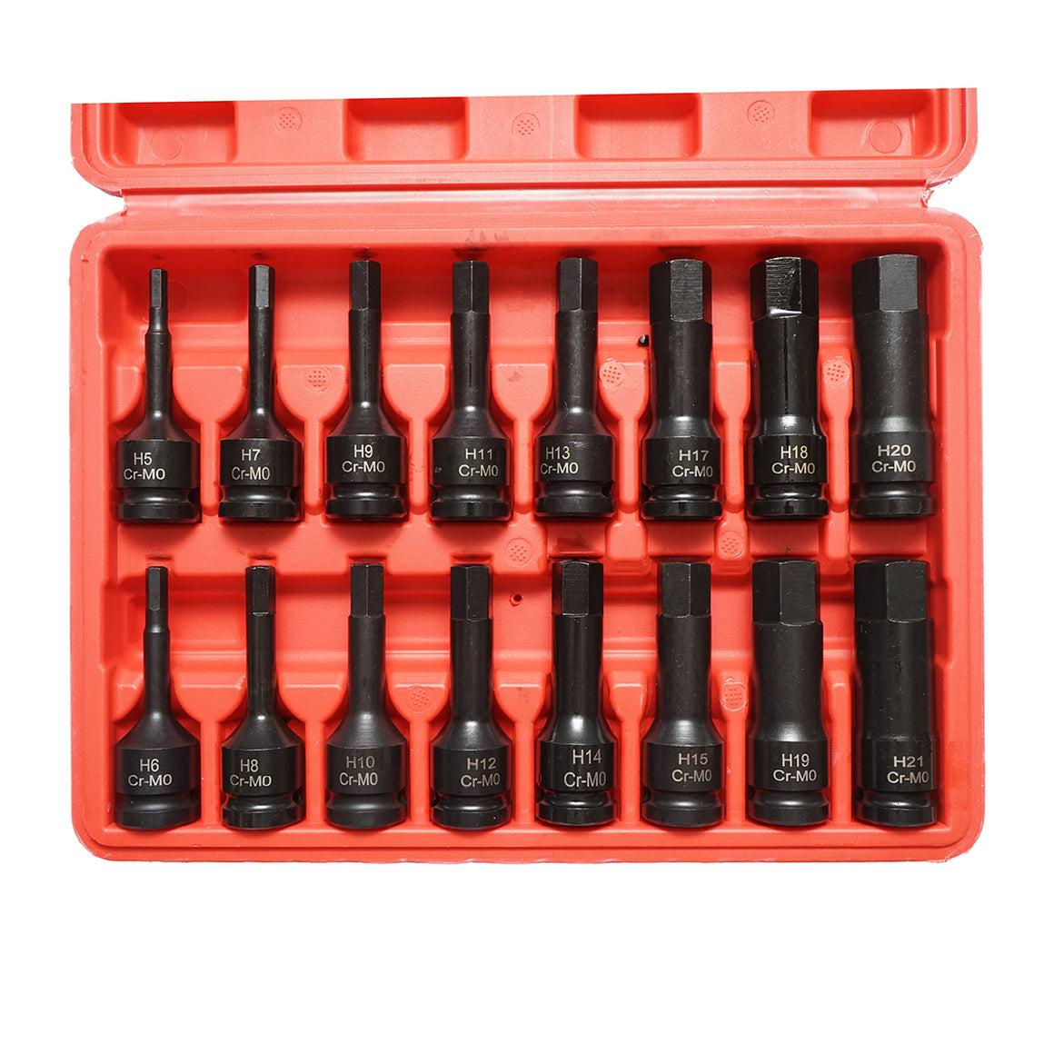 Long hexagonal impact socket set H5-H21, 1/2 inch square drive Cr-Mo, 16 pieces